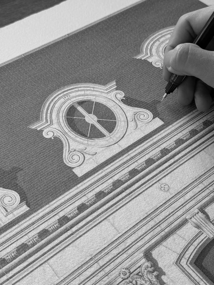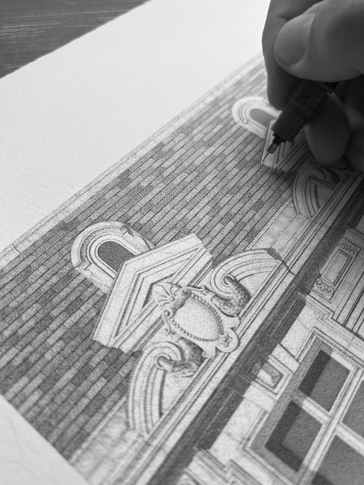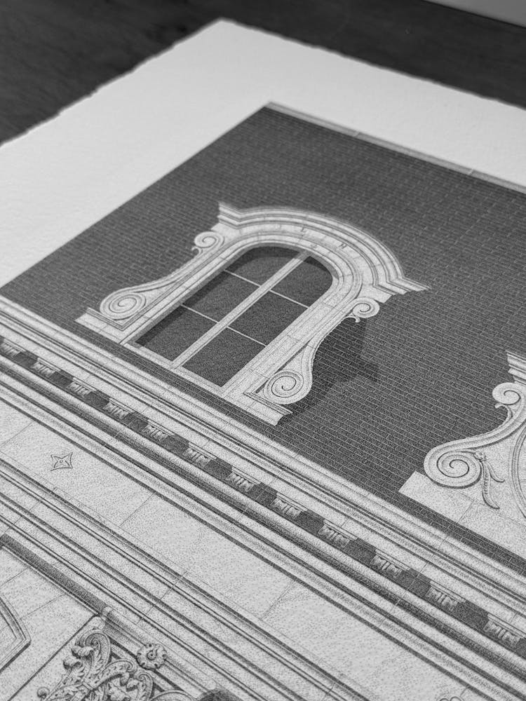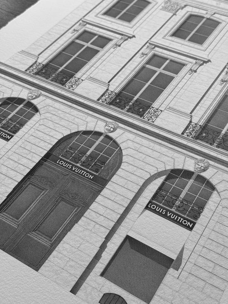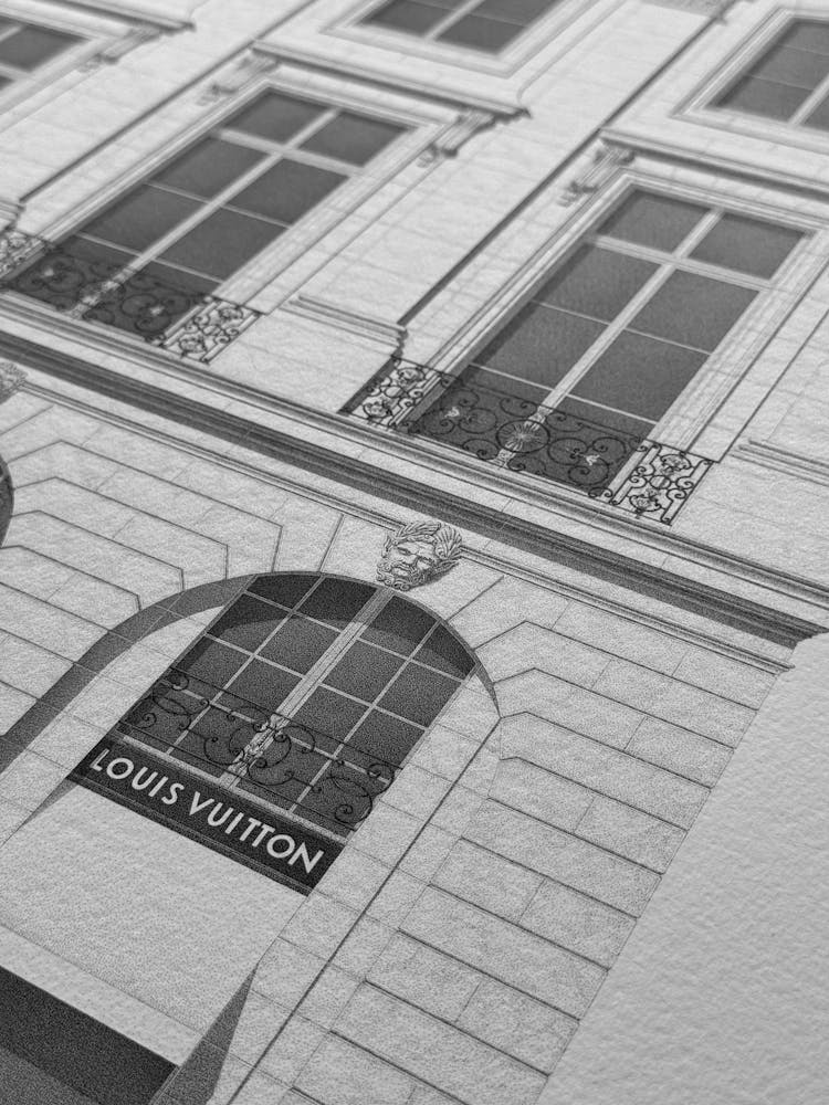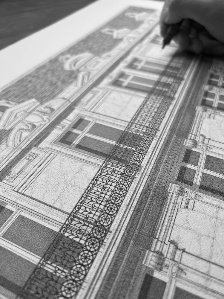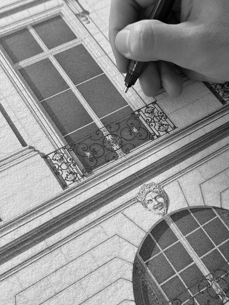 New project for Louis Vuitton: a large-scale stippled drawing of the iconic façade, now exhibited at Louis Vuitton, 2 Place Vendôme, Paris.