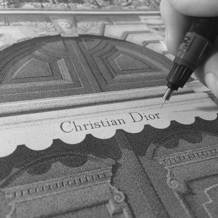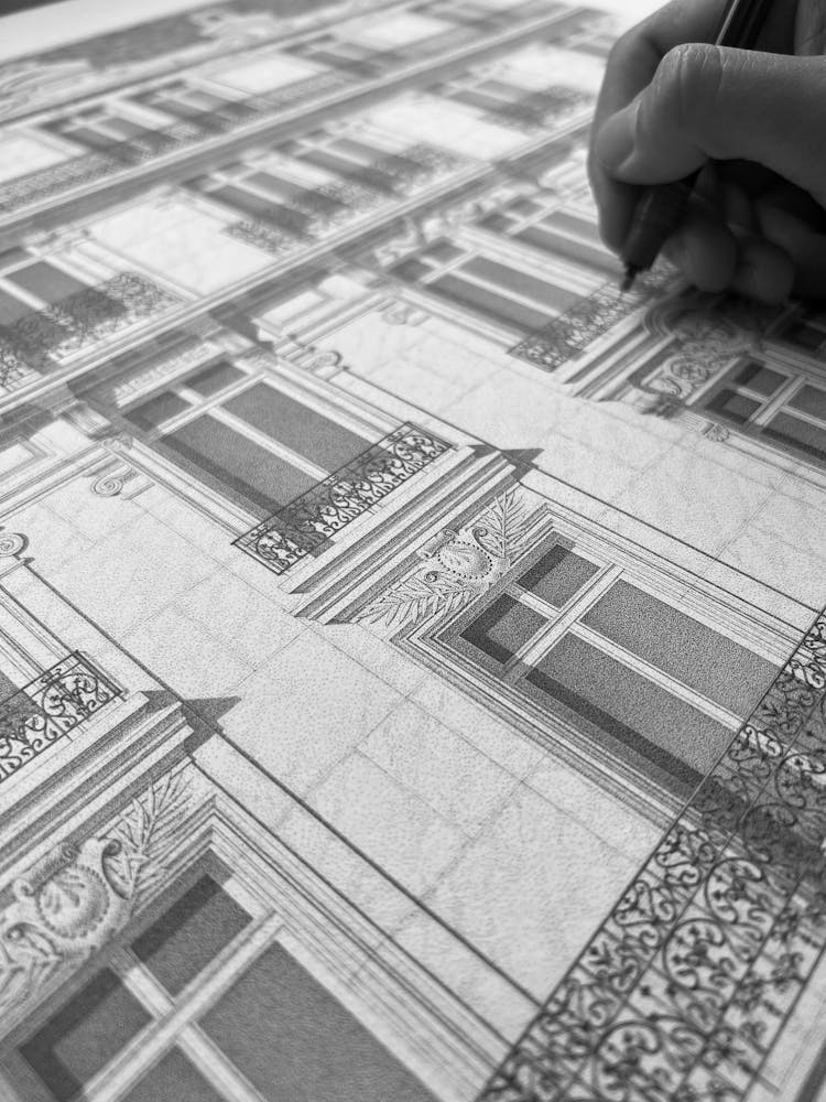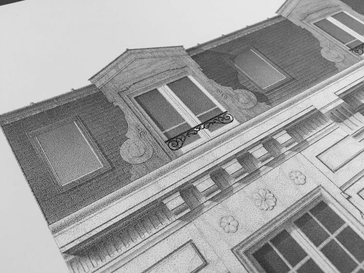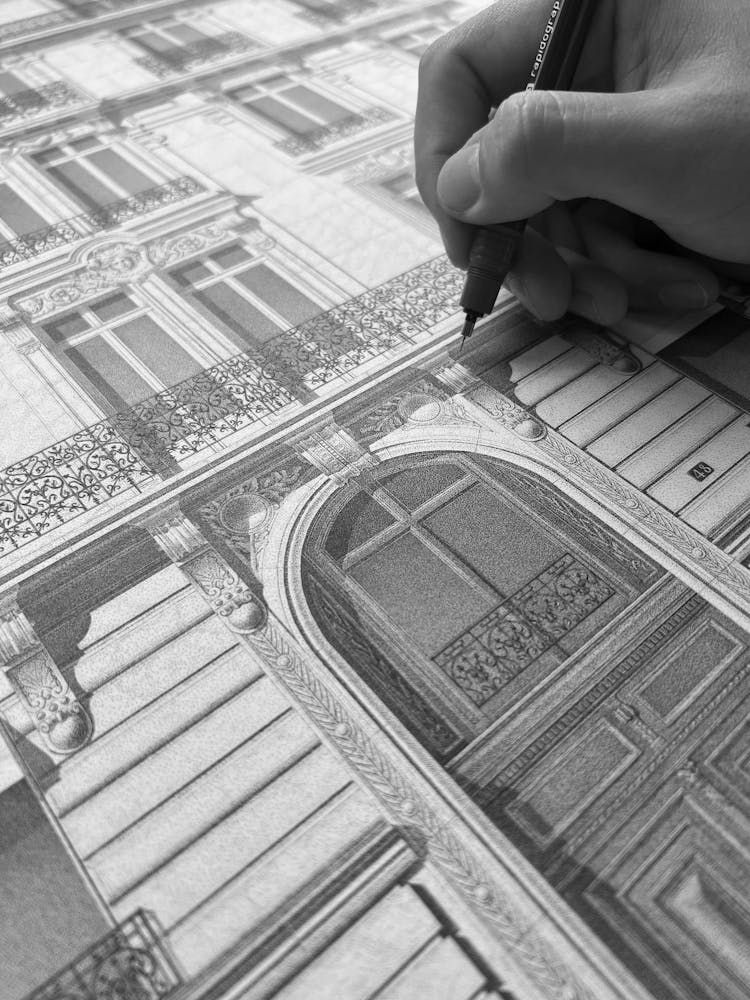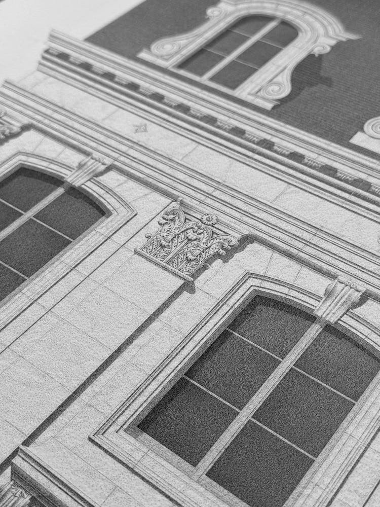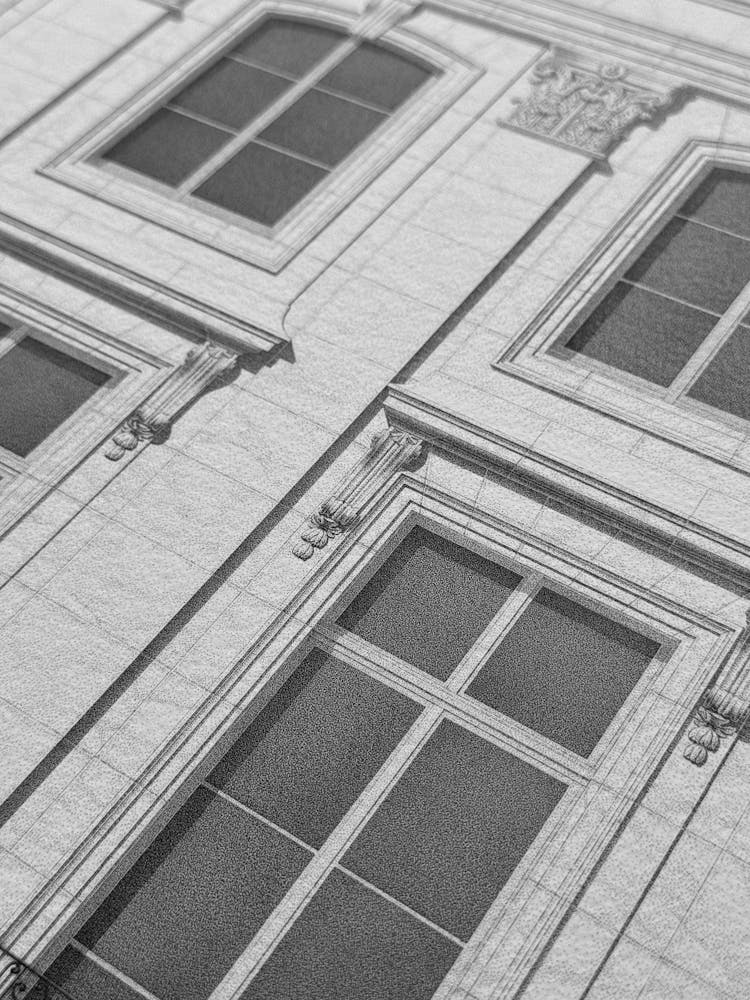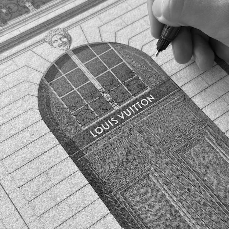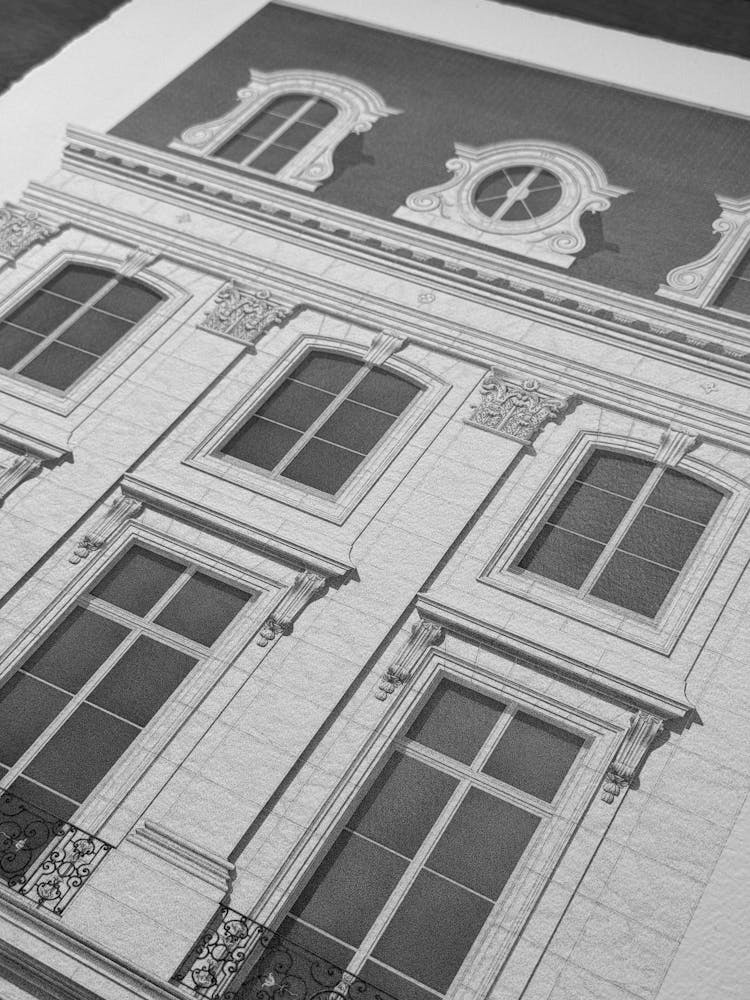 New project for Louis Vuitton: a large-scale stippled drawing of the iconic façade, now exhibited at Louis Vuitton, 2 Place Vendôme, Paris.