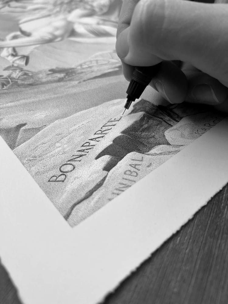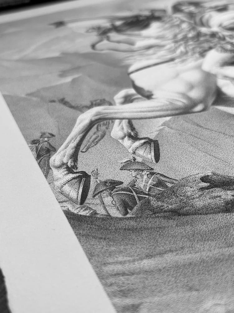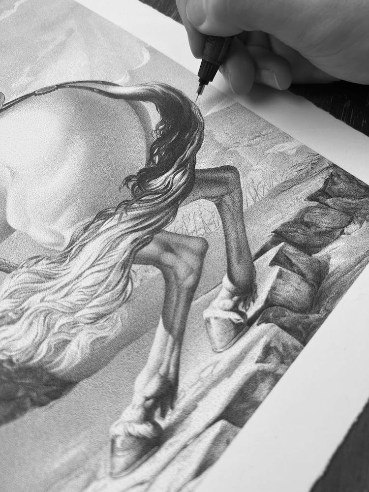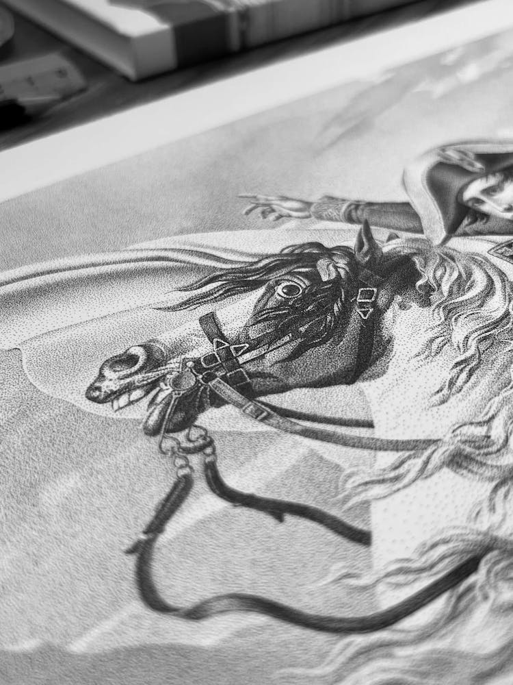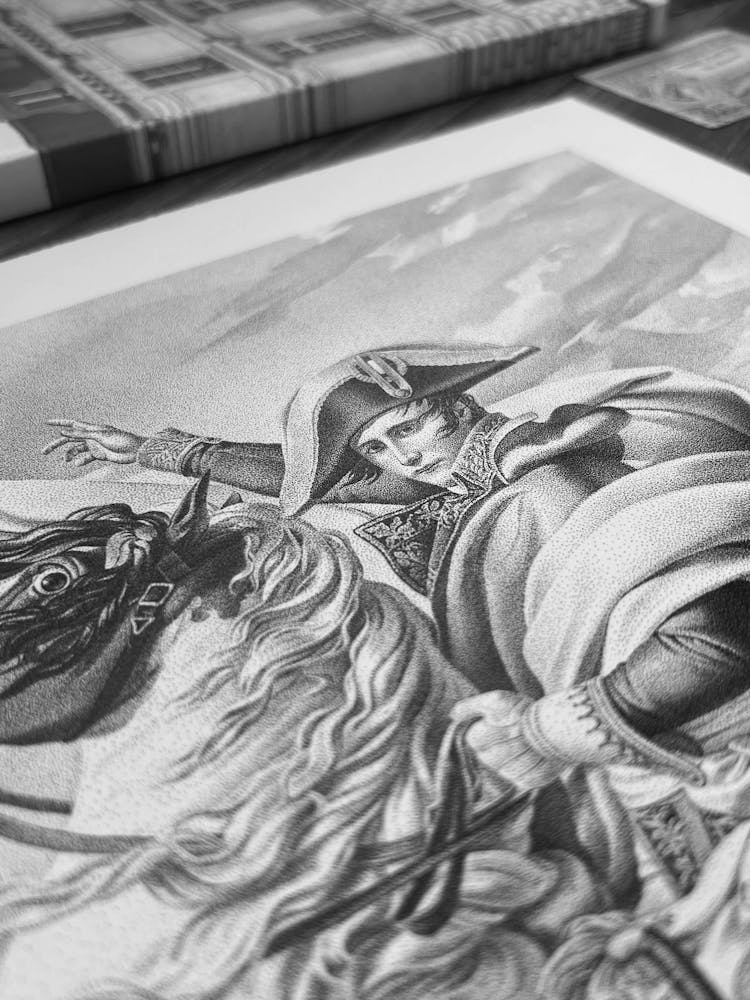 Xavier Casalta is a French artist internationally recognized for his masterful stippling technique. Using only black ink, he meticulously places millions of tiny dots over thousands of hours, creating artworks of exceptional depth and intricacy.